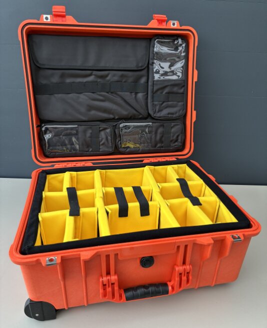 Oranje Peli Case 1560 met Trolley, Dividers en Lid Organizer tbv 15" Laptop.